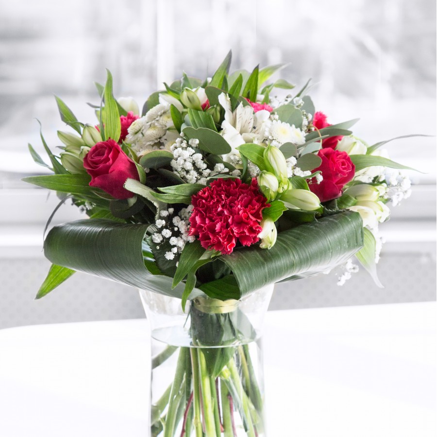 Immerse yourself in the elegant beauty and distinctive allure of our exquisite bouquet. This stunning arrangement features passionate red roses and carnations intertwined with delicate white chrysanthemums and gypsophila, artfully complemented by white alstroemeria and aspidistra leaves for a harmonious design.